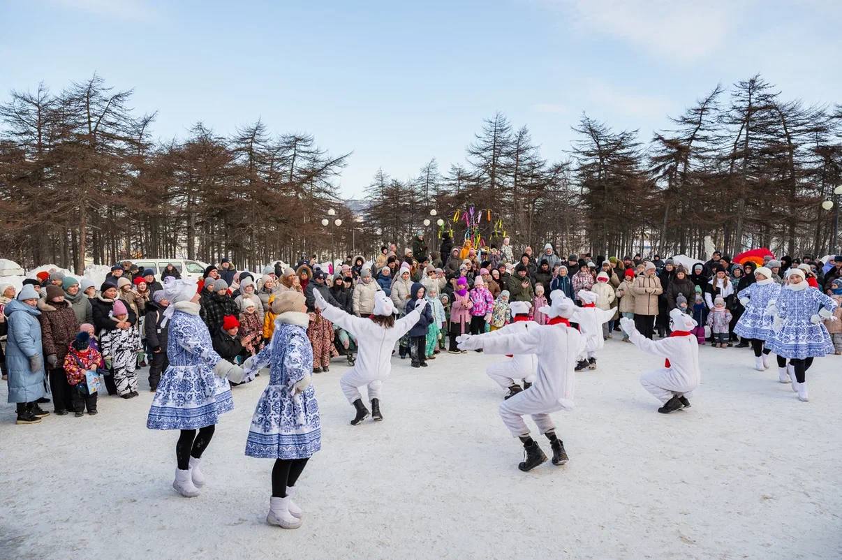Широкую Масленицу отмечали забавами, шутками, песнями и плясками. Танцевали Белые медведи и Снегурочки «Скоморошины», малыши повторяли за скоморохами разные движения под веселую музыку, радовали магаданцев знаменитыми песнями «Ой, мороз», «Кадриль», «Валенки», «Ой, вставала я ранехонько» ансамбль «Русский лад» и Е. Нилова. Дети наперегонки катали друг друга на тюбинге, передавали блины, перетягивали канат, бились на подушках, на скорость заплетали косы из лент, и в качестве награды получали сладкие призы.