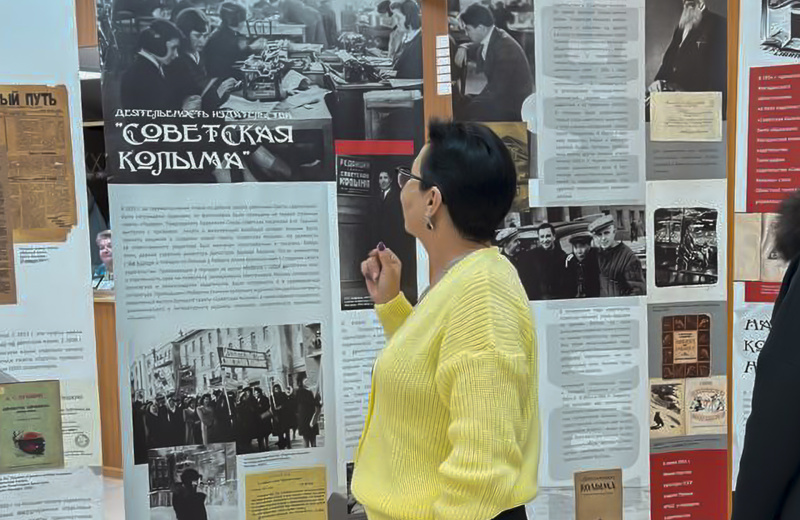 Передвижная выставка снабжена уникальными архивными фотографиями, иллюстрирующими начало издательского дела эпохи Дальстроя, первые книжные выпуски, работу сотрудников и другие важные страницы истории.