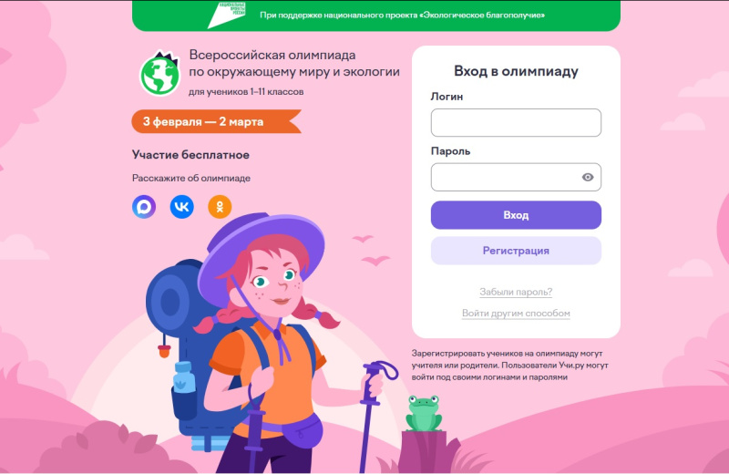 Для участия необходимо зарегистрироваться на сайте или войти с логином и паролем от Учи.ру. Для успешного прохождения олимпиады не требуется углублённых знаний школьной программы. В заданиях ребёнка ждёт не только полезная, но и интересная информация и факты об окружающем мире. В этом году участникам предстоит узнать, как себя вести в заповеднике, почему полезно разделять мусор, можно ли превратить свалку в курорт, и какой журавль встречается только в России. Отдельное место в заданиях получила тема личного вклада в экологическое благополучие.