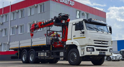 Модели КАМАЗ 65117 с КМУ на шасси оснащены удобным в обращении крано-манипуляторным управлением. Самоходная установка с колесной формулой 6*4, имеет предельный вылет стрелы до 22.6 м, бортовой тип ТС и грузоподъемность до 14.5 т.